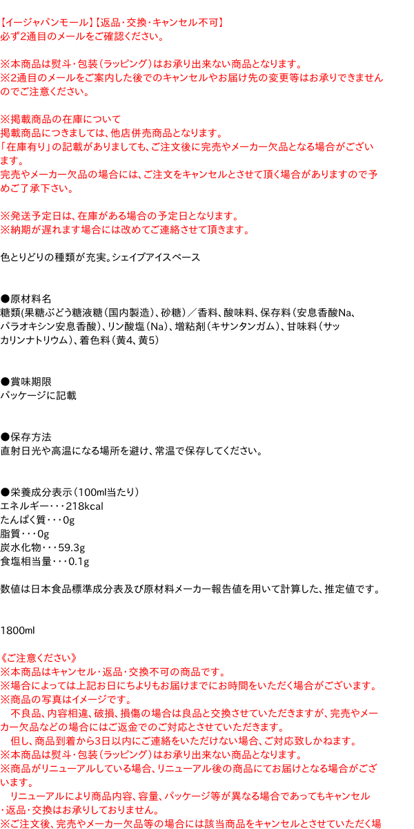 シェイブアイスベース ●原材料名 糖類(果糖ぶどう糖液糖(国内製造)、砂糖)/香料、酸味料、保存料(安息香酸Na、パラオキシン安息香酸)、リン酸塩(Na)、増粘剤(キサンタンガム)、甘味料(サッカリンナトリウム)、着色料(黄4、黄5) ●賞味期限 パッケージに記載 ●保存方法 直射日光や高温になる場所を避け、常温で保存してください。